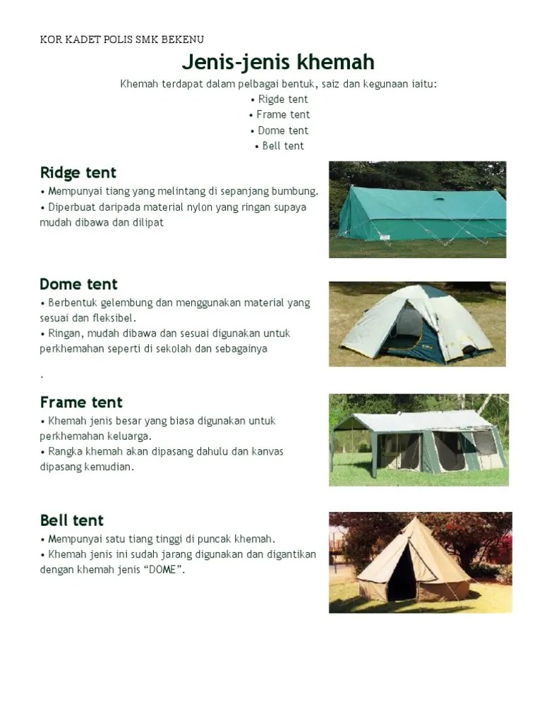Tanpa khemah anda tidak boleh berkhemah. Ringan, mudah dibawa dan sesuai digunakan untuk perkhemahan seperti di sekolah dan sebagainya. Frame tent khemah rangka besar / jenis besar biasa digunakan . Di bawah ini adalah beberapa jenis . Khemah untuk perkhemahan rekreasi jatuh ke dalam dua kategori. Walaupun dua minggu sebelum ke . Didirikansemasa perhimpunan pengakap jambori dankorobori.